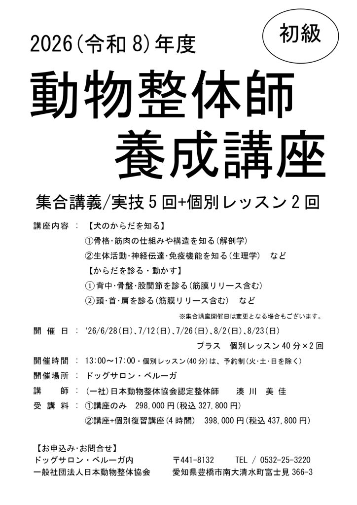【 お申込 】ドッグサロン・ベルーガ内 一般社団法人日本動物整体協会